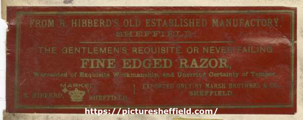 ![Label for fine edged razor, by R. Hibberd and exported by Marsh Brothers and Co.[ Ltd., Ponds Steel Works, Shude Lane], Sheffield](https://www.picturesheffield.com/imagefiles/jpgl_sheffield3//arc08149.jpg)