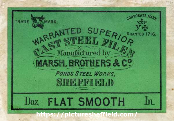 ![Label for warranted superior cast steel files, flat smooth, manufactured by Marsh Brothers and Co.[Ltd.], steel manufacturers, Ponds Steel Works,[Shude Lane], Sheffield, England, c.1906](https://www.picturesheffield.com/imagefiles/jpgl_sheffield3//arc08187.jpg)
