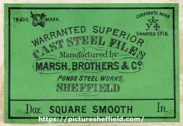 ![Label for warranted superior cast steel files, square smooth, manufactured by Marsh Brothers and Co.[Ltd.], steel manufacturers, Ponds Steel Works,[Shude Lane], Sheffield, c.1906](https://www.picturesheffield.com/imagefiles/jpgl_sheffield3//arc08189.jpg)