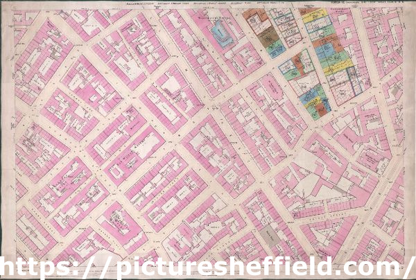 This map features: Top Left: Fitzwilliam Street, Bath Street, Broomhall Street, Headford Street, Thomas Street, Bowden Street, Milton Street, Monmouth Lane, Thomas Lane, Fitzwilliam Lane, Egerton Lane, Washington Hotel (public house), Broomhall Tavern (public house), Bath Hotel (public house), smithy, Mission Room, Dog and Gun (public house), Bath Works (cutlery) (entrance on Bath Street), [George Travis and Co], Clarence Works (silver and Britannia metal) (Bath Street), Fitzwilliam Works (edge tools) (entrance on Fitzwilliam Lane), Acorn Works (cutlery etc) (on Bowdon Street), [Ernest H. Hill?] Beta Works (electrical plate etc) (entrance on Fitzwilliam Lane), [William Beatson & Sons?] Albion Works (silver, German silver etc) (entrance on Fitzwilliam Lane), Brunswick Hotel (public house), malthouse, [George Wostenholm and Son Limited] Washington Works (cutlery) (on Wellington / Bowdon Street / Eldon Street), and [James Howarth and Sons] Broomspring Works (steel, files, saws etc) (entrance on Bath Street).Bottom Left: Headford Street, Young Street, Egerton Street, Egerton Lane, Milton Street, Thomas Street, Hodgson Street, Moore Street, Clarence Street, Dene Lane, Milton Lane, Warner Place, Evans Street, [Lambert Brothers? / A. Davy and Sons?] Exchange Works (cutlery) (on Egerton Street), [George Bagshaw and Son] Headford Works (crucibles) (on Egerton Lane), [Atkinson Brothers] Milton Works (steel, saws, files, cutlery) (Milton Street), [Needham, Veall and Tyzack Ltd.] Eye Witness Works (steel, saws, edge tools, cutlery) (on Egerton Lane), Milton Brass Foundry, [John McClory and Sons] Continental Works (steel, saws, edge tools, cutlery) (on Milton Street), and [St. Silas Church of England School] (on Hodgson Street).Top Right: Bowden Street, Fitzwilliam Street, Button Lane, Milton Street, Eldon Street, Trafalgar Lane, Trafalgar Street, Rockingham Street, Rockingham Lane, Cross Rockingham Lane, [Joseph Allen and Sons?] Ecclesall Works (cutlery) (on Rockingham Street), Trafalgar Place (cutlery) (on Trafalgar Street), Hallamshire Works (cutlery) (on Rockingham Street), Montgomery Works (cutlery) (on Rockingham Street), Wentworth House (public house), St Lawrence Works (joiners and edge tools) (Trafalgar Street / Button Lane), Eldon Place (electroplate and Britannia metal) (on Eldon Street), Empress Works (cutlery) (on Eldon Street), [Yates Brothers?] Nimrod Works (cutlery, electroplate etc) (Trafalgar Lane / Eldon Steet, Alexandra Hotel (public house), Economical Hotel (public house), [John Blyde] Clintock Works (cutlery) (on Milton Street), Milton Arms (public house), [Atkinson Brothers] Beehive Works (cutlery) (on Bowdon Street), Sunday School, [St Jude’s National] School (on Bowdon Street), St Jude’s Church, and Jew’s Burial Ground (Disused) [Jewish].Bottom Right: Button Lane, Bowden Street, Fitzwilliam Street, Thomas Street, Moore Street, Green Street, South Street, The Moor, tramway, Cumberland Street, Well Lane, Cumberland Lane, Jessop Street, Rockingham Street, Eldon Street, Prince Street, Pump Tavern (public house), Sheffield Moor Hotel (public house), Sunday School, [South Street Methodist New Connexion Chapel] New Connexion Methodist Chapel (on South Street Moor), Brunswick Bone Works (on Eldon Street), smithy, Princess Hotel (public house), Peacock Inn (public house), Crown and Anchor (public house), [Salvation Army Meeting House] Mission Room (on Thomas Street), and[John Round and Son?] Tudor Works (cutlery etc) (on Thomas Street).Additional information from White's General and Commercial Directory of Sheffield, 1896 / Graces Guide.Dimensions 77 x 102 cm.Scale 10.56 feet : 1 mile [1:500] |