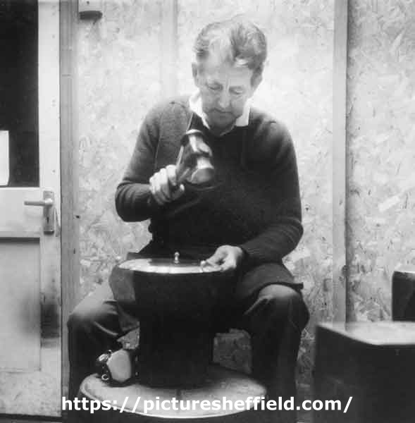 | Derek Hinchsliffe, flat hammerman at Draper and Lamb, silversmiths, No.2 Newton Lane | |