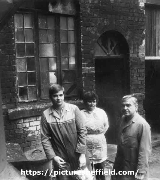 | Stephen, Joyce and Ron Birch outside the Butcher's Wheel Workshop, Arundel Street | |