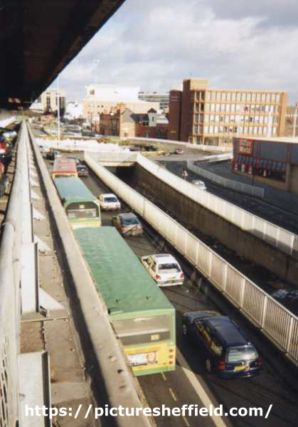 | Eyre Street underpass looking towards Furnival Square showing (top right) Arundel House and (right) Office World, stationers and office equipment | |