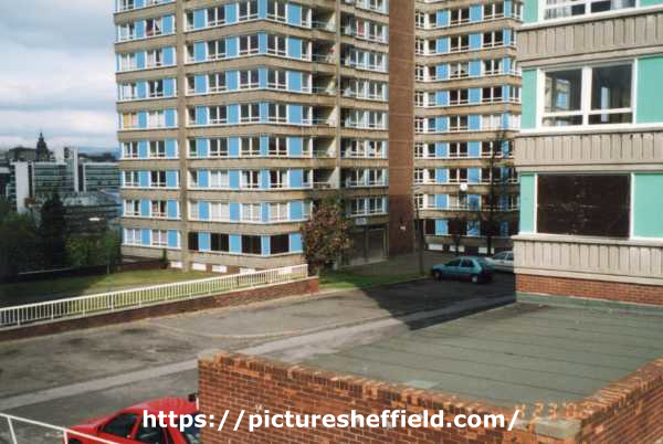 | Claywood Flats showing view over garages to Norfolk tower block | |
