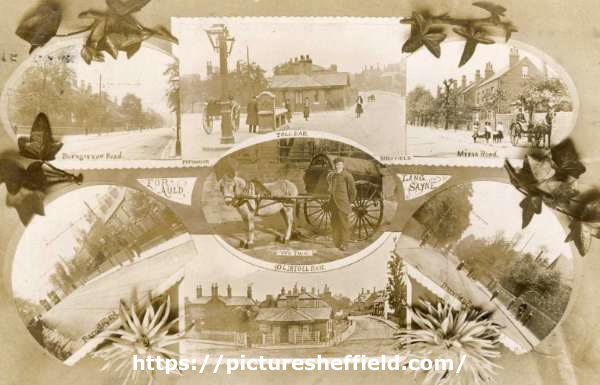 | Composite postcard of Pitsmoor showing Burngreave Road, Minna Road, Barnsley Road and the [new] toll bar (top) and old toll bar (bottom) | |