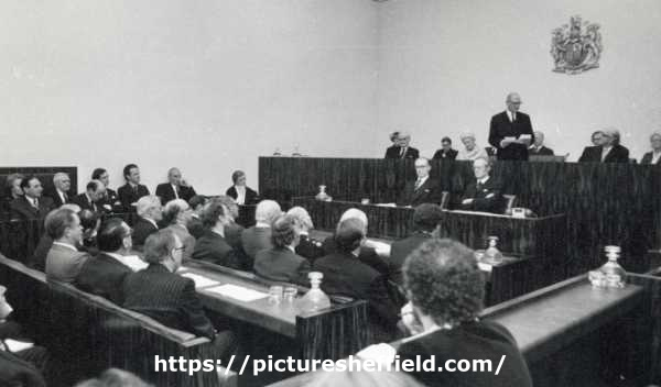 | Opening of the new Sheffield Magistrates Court, Snig Hill showing (second right raised bench) the Lord Chancellor, Lord Elwyn-Jones (1909 - 1989) and (fourth left) Councillor Mrs Winifred Golding, Lord Mayor, 1977 - 1978 | |