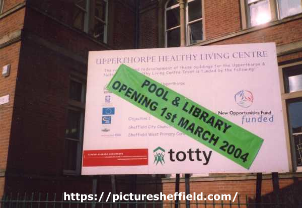 Board reads: Upperthorpe Healthy Living Centre. Pool and library opening 1st March 2004. New Opportunities Fund funded. [Constructor] Totty. [Architects] Taylor Stancer Architects. |