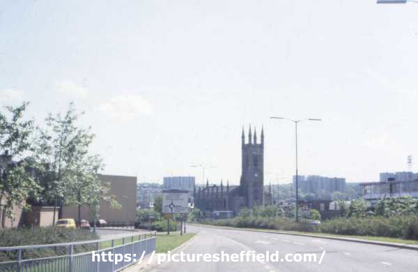 | St. Mary's Gate looking towards Bramall Lane roundabout showing (centre) St. Mary C. of E. Church, Bramall Lane and (left) Ellin Street | |