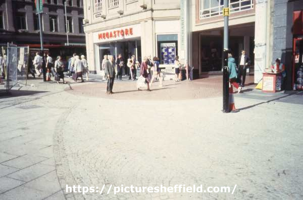 | Fargate showing (top centre) No. 66 Virgin Megastore and (top right) entrance to Orchard Square Shopping Centre | |