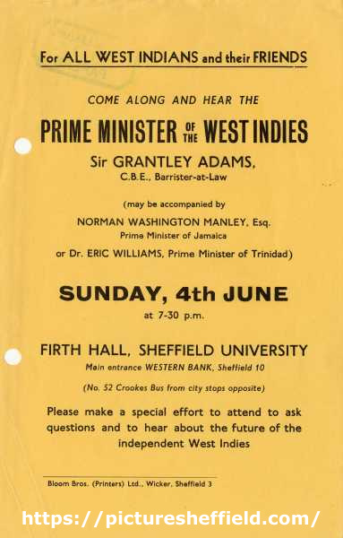 ![For all West Indians and their friends - come along and hear the Prime Minister of the West Indies Sir Grantley Adams at Firth Hall, Sheffield University, 4 Jun [1961]](https://www.picturesheffield.com/imagefiles/jpgl_sheffield3//y15332.jpg)
