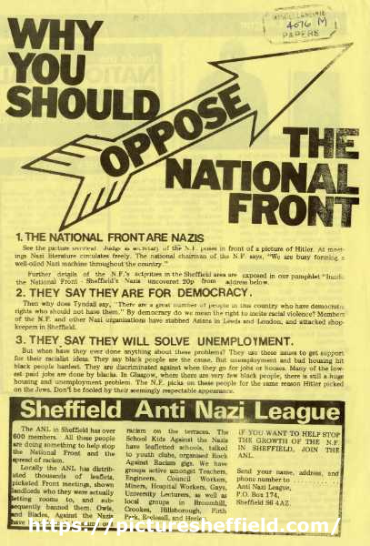 | Why you should oppose the National Front, by the Sheffield Anti-Nazi League, 1970s (front) | |