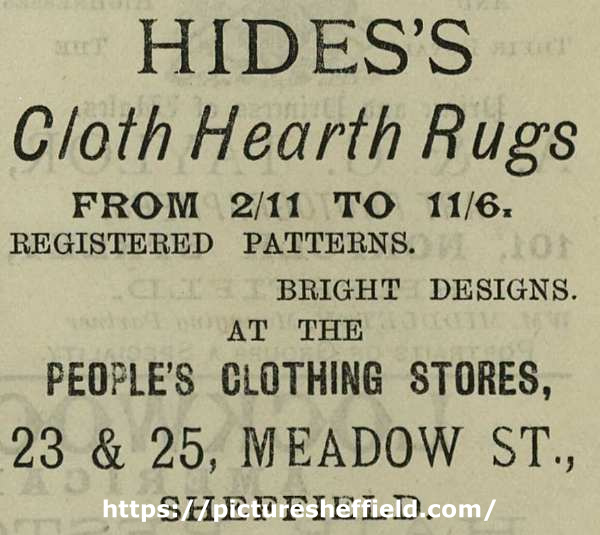 Advertisement reads: Hides's cloth hearth rugs from 2/11 to 11/6. Registered patterns. Bright designs. At the People's Clothing Stores, 23 and 25 Meadow St., Sheffield. Image from The Bee, vol. 1 no. 7 (page 2) (Sheffield Local Studies Library: 052.74 S). |