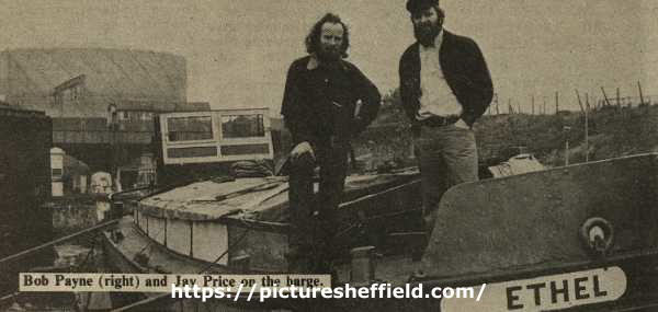 Bob Payne and Jay Price have been supervising young people who have been before the juvenile courts in renovating the 'Ethel'. The project was funded through Urban Aid and the Coincil's Planning Department took it over in July 1975. The boat's latter years had been spent carrying coal and she came with a bare hull, no engine, no wheel house and no decking. <span>Included (top left) is the gas holder for the Effingham Street Gas Works.</span> From Town Hall Talk, Summer 1976 (page 3) (Sheffield Local Studies Library: 352.042 SQ) |