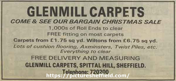 | Advertisement for Christmas sale at Glenmill Carpets, Spital Hill | |