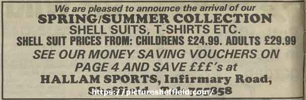| Advertisement for Hallam Sports, sports shop, junction of Infirmary Road and Bedford Street | |