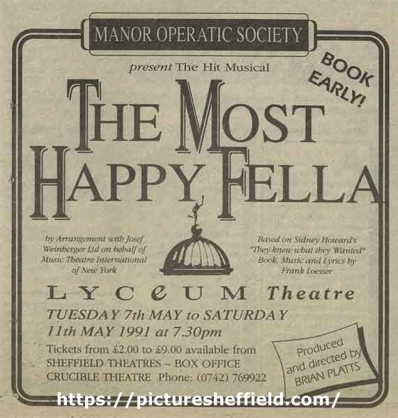 | Advertisement for the musical 'The Most Happy Fella' by Manor Operatic Society at the Lyceum Theatre | |