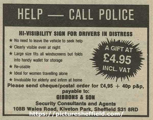 | Advertisement for Gibbons and Son, security consultants and agents, No. 108B Wales Road, Kiveton Park | |