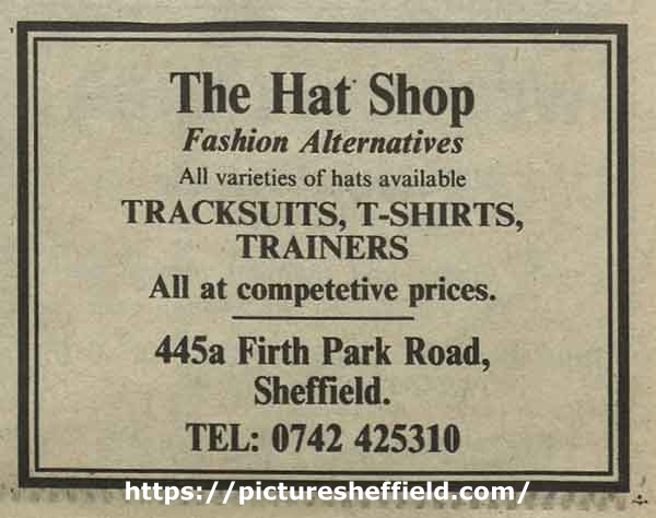 | Advertisement for The Hat Shop, fashion shop, No. 445a Firth Park Road | |